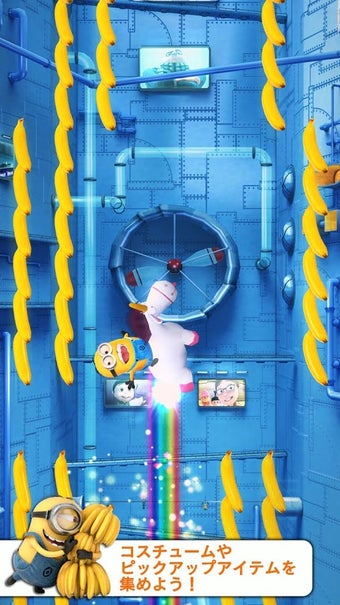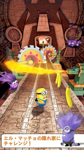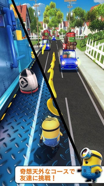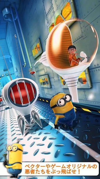 怪盗グルーのミニオンラッシュは映画「怪盗グルーのミニオン危機一髪」のキャラクターを操作する、ユーモアたっぷりのランニングゲームです。いたずら好きでお調子者の黄色い生物“ミニオン”を操り、誰よりも速く走って「今年のミニオン」の座を目指しましょう。ゲームの形式はSubway Surfers、Temple Run、パックマンダッシュ!などの疾走系ゲームとほとんど同じですが、怪盗グルーのミニオンラッシュはグラフィックが綺麗で映画の世界観をそのまま味わえ、さらにミニゲームでも遊べるなど夢中になる要素が多いので飽きずに楽しめます。「ジャンプ」、「スライディング」、「かがむ」のアクションで軽やかに障害物を避け、ミニオンのボスである怪盗グルーに怪盗っぷりをアピールしましょう。ゲーム内ではグルーの研究所や住宅街など映画のシーンをベースにしたステージを疾走しながら、爆弾やミサイルなど行く手を阻む障害物をタイミングよくスワイプでかわします。ジャンプ台を使って跳ねたりパイプを滑り降りたり、迫力とスピード感のあるギミックが豊富なので映画を見ていなくても十分に楽しめます。グラフィックも美しく障害物やステージが毎回変化するといった工夫のおかげで、ほかの疾走系ゲームよりは大分抑えられてはいますが、どうしてもゲームの性質上、人によっては繰り返しが多いと感じてしまうかもしれません。